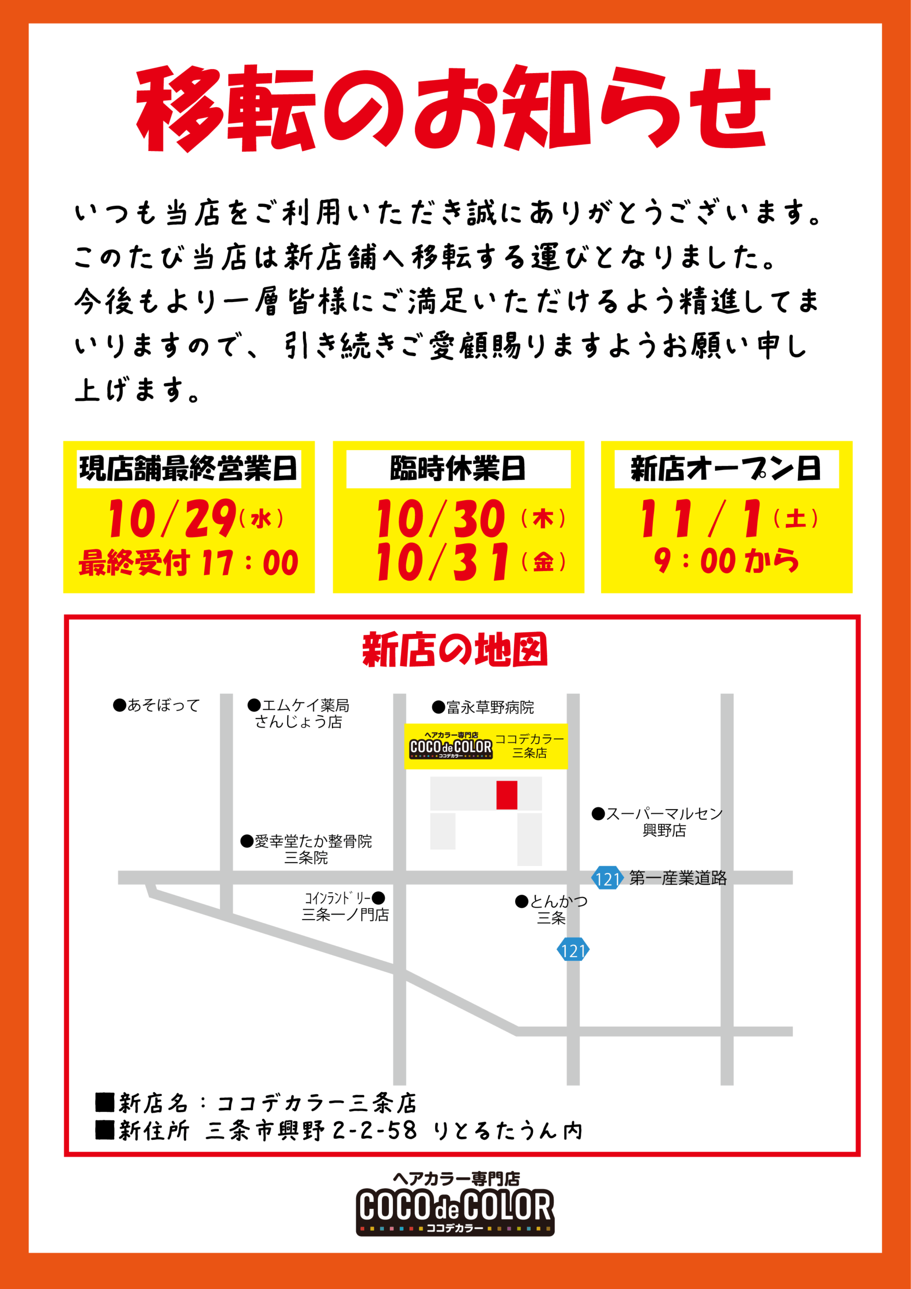• 新店舗オープン(ココデカラー三条店):11月1日(水)